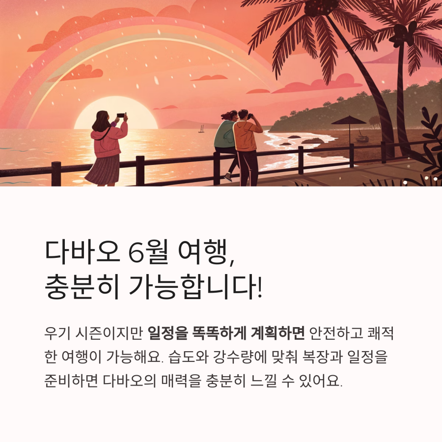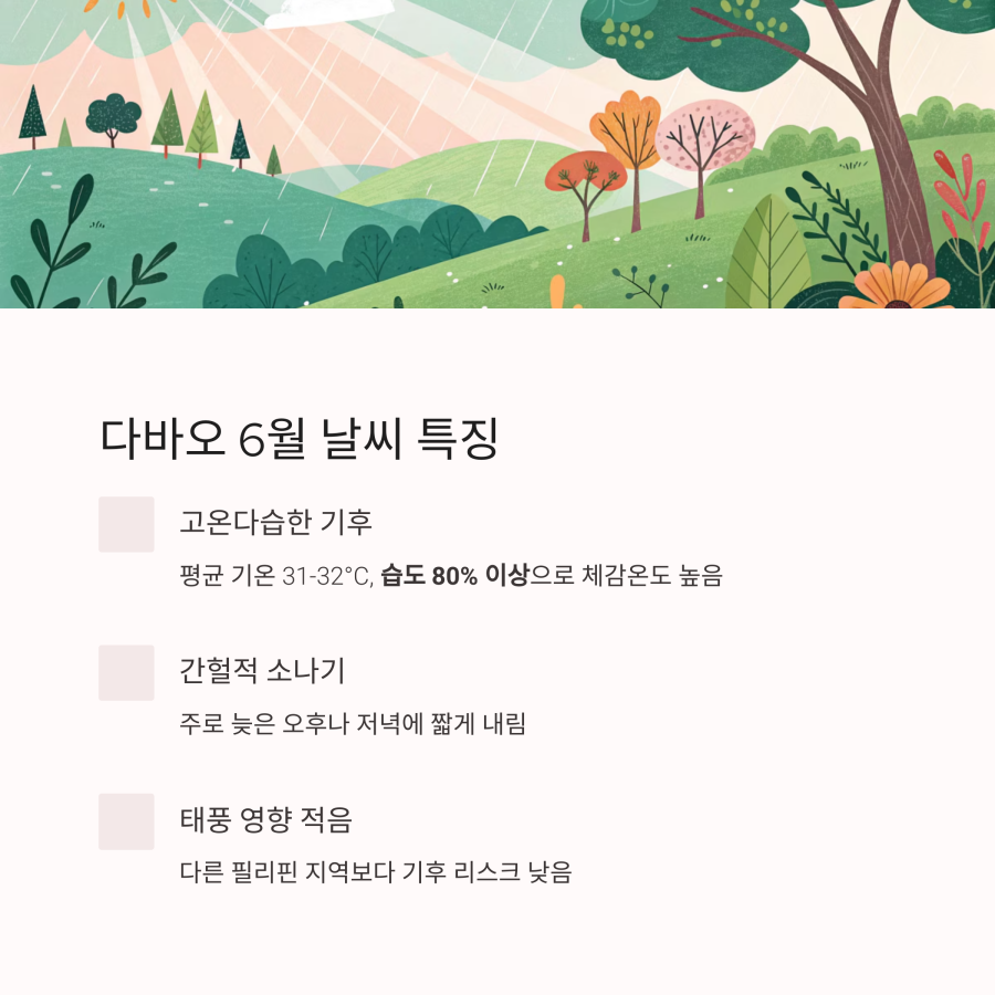 6월의 다바오는 낮 기온이 높고 오후에 소나기가 자주 내리므로 아침 시간에 주요 관광 일정을 집중하는 것이 좋아요.