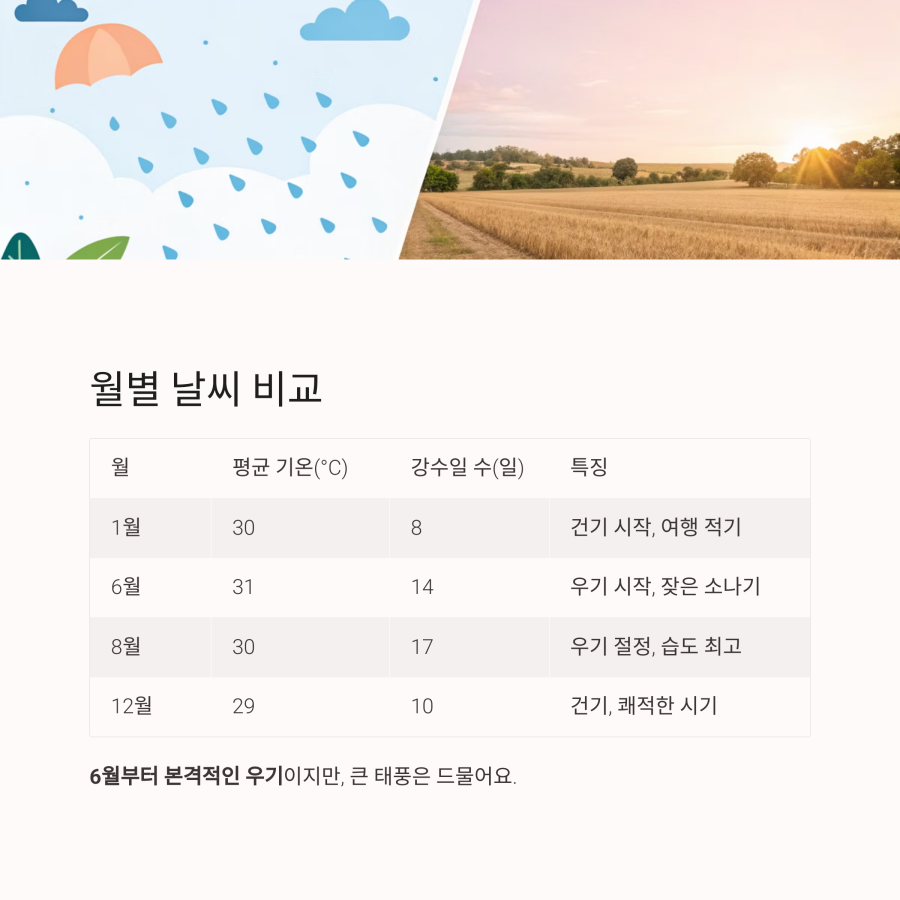 | 8월 | 30 | 17 | 우기 절정, 습도 최고 |