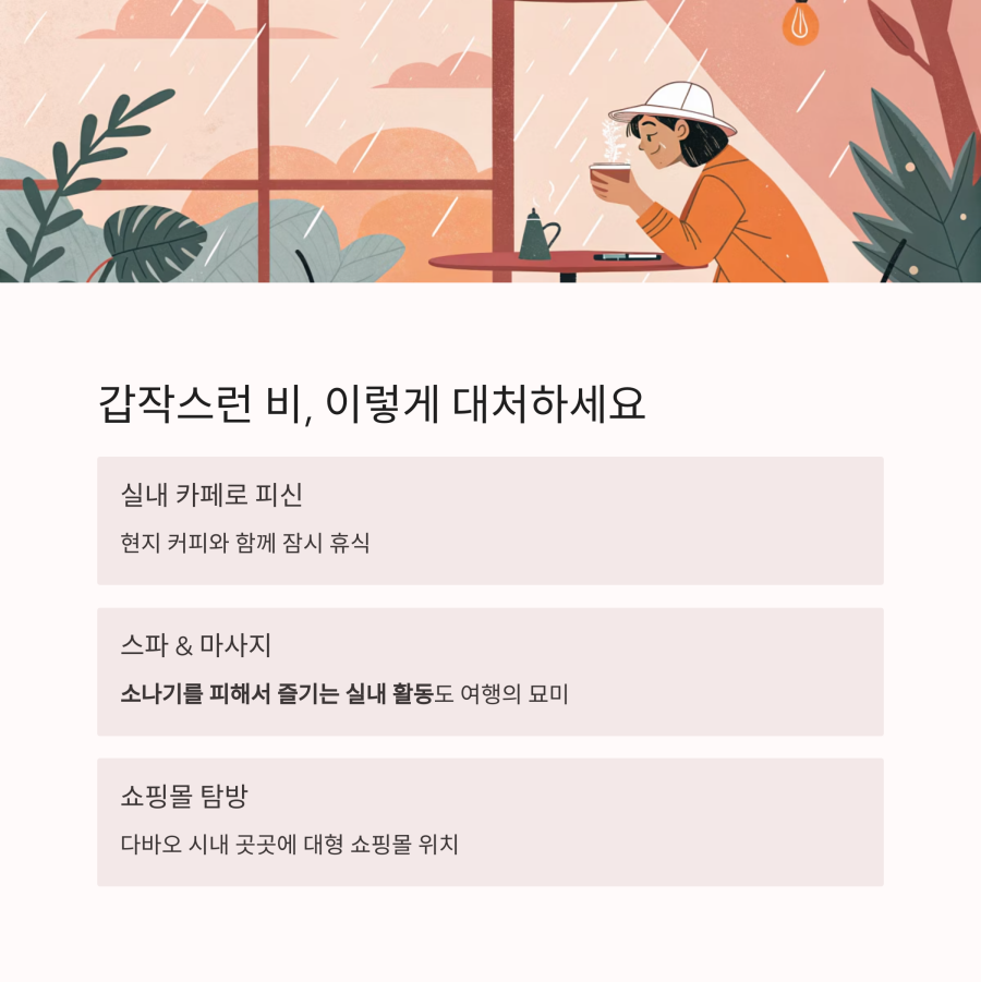 이럴 때는 근처 실내 카페로 피신하거나 현지 스파나 쇼핑몰로 이동해 빗속 휴식 타임을 가지는 것도 좋아요. 다바오 시내는 대형 쇼핑몰이 곳곳에 있어 갑작스러운 날씨 변화에도 대응이 쉬워요. 소나기를 피해서 즐기는 실내 활동도 여행의 묘미랍니다.